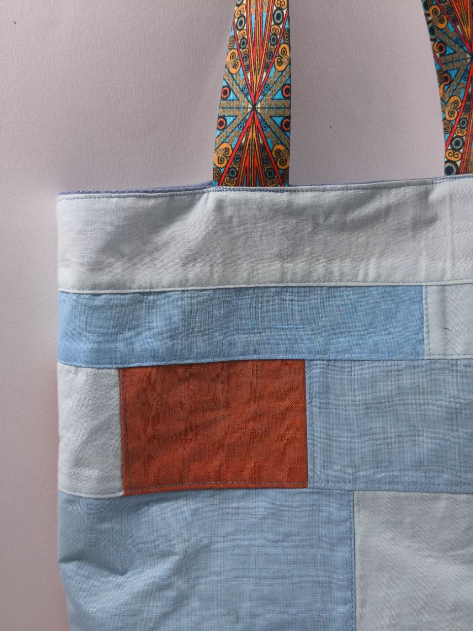 Borsa patchwork realizzata con materiale tessile di recupero.