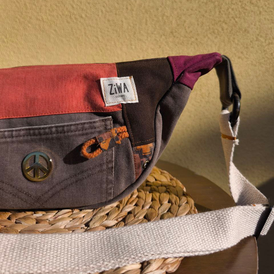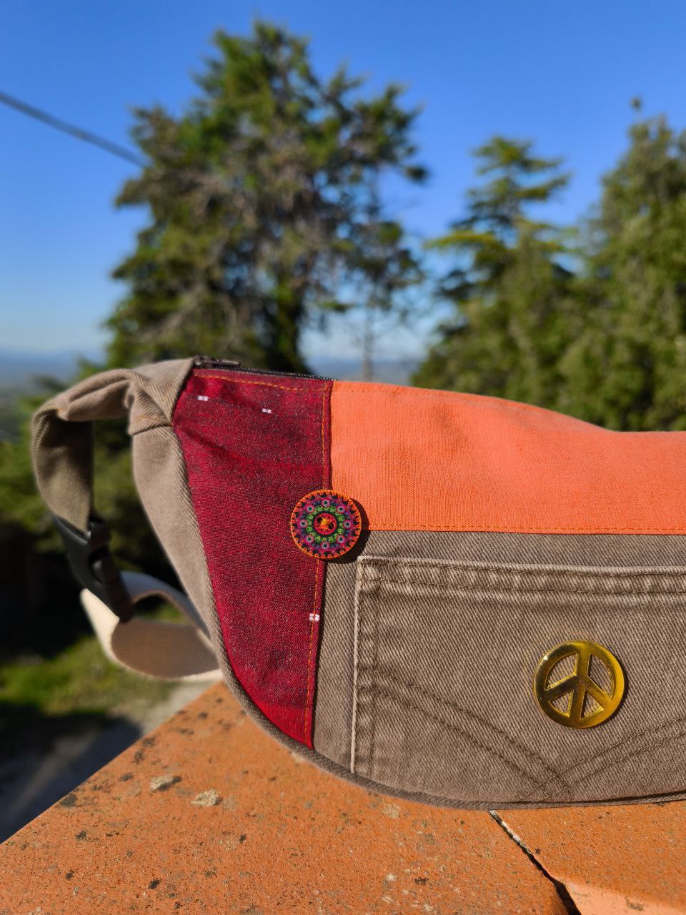Questo marsupio è realizzato interamente con materiali tessili di recupero. E' molto capiente ed ha all'interno due piccole tasche aperte e una con cerniera. Ideale per chi cerca accessori originali e sostenibili.
