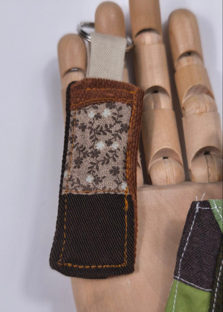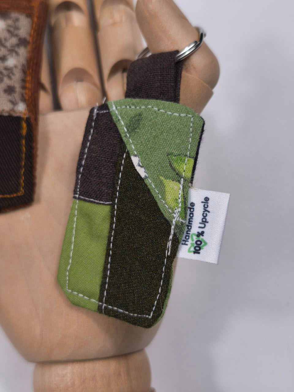 Coppia di portachiavi realizzati per recuperare ogni ritaglio di stoffa e dar valore a materiale altrimenti sprecato.