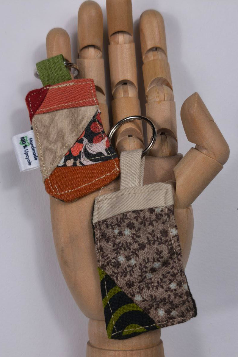 Coppia di portachiavi realizzati per recuperare ogni ritaglio di stoffa e dar valore a materiale altrimenti sprecato.