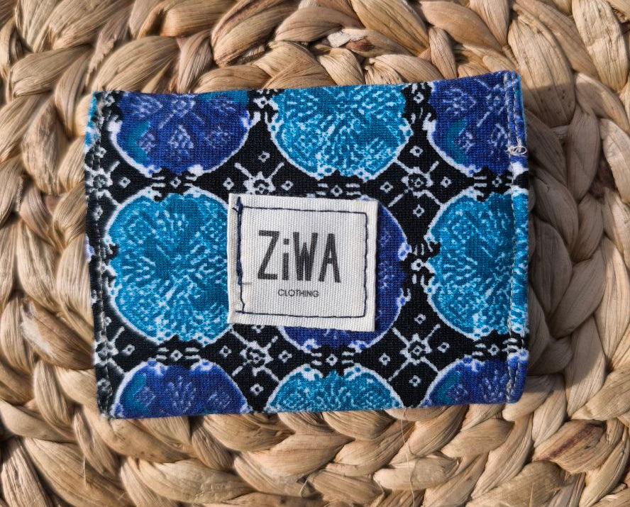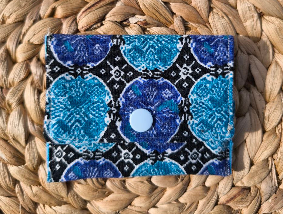 Portatessere blu con fantasia geometrica e fodera interna azzurra. Interno diviso in tre scompartimenti, ideale per carte e biglietti da visita.